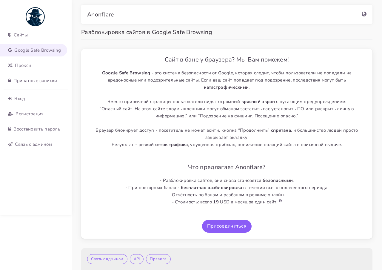 This site at anonflare.com impersonates Google Safe Browsing content, presenting a Google-themed interface and Russian text about Google Safe Browsing. The URL path contains /google/ and the page title references Google Safe Browsing, while the hostname is not google.com. The SPA likely renders credential capture elements via JavaScript bundles, and the page includes numerous external scripts and a redirect-friendly post endpoint, indicating an attempt to harvest credentials under the guise of Google safety features.