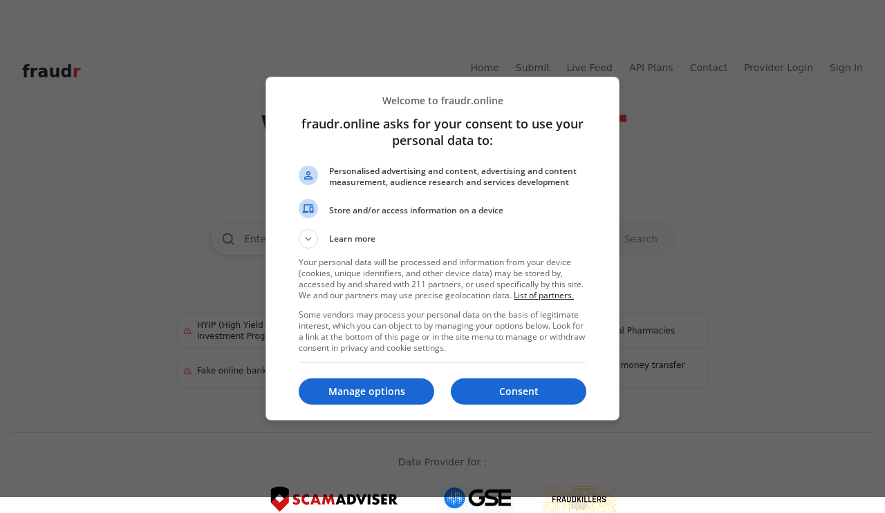 Fraudr.online presents a consent modal over a generic homepage. The page title and branding indicate fraudr.online, but the visual screenshot shows a consent/privacy dialog over a legitimate-looking UI rather than a known impersonation of a specific widely-used brand. The evidence suggests a generic fraud/monitoring page with multiple third-party scripts and trackers, including Google ads and funding choices prompts, which can be leveraged for user data collection. No definitive credential harvesting form is observed in the static HTML, but the presence of iframes, external trackers, and potential off-domain POST activity indicates data collection behavior that warrants scrutiny.