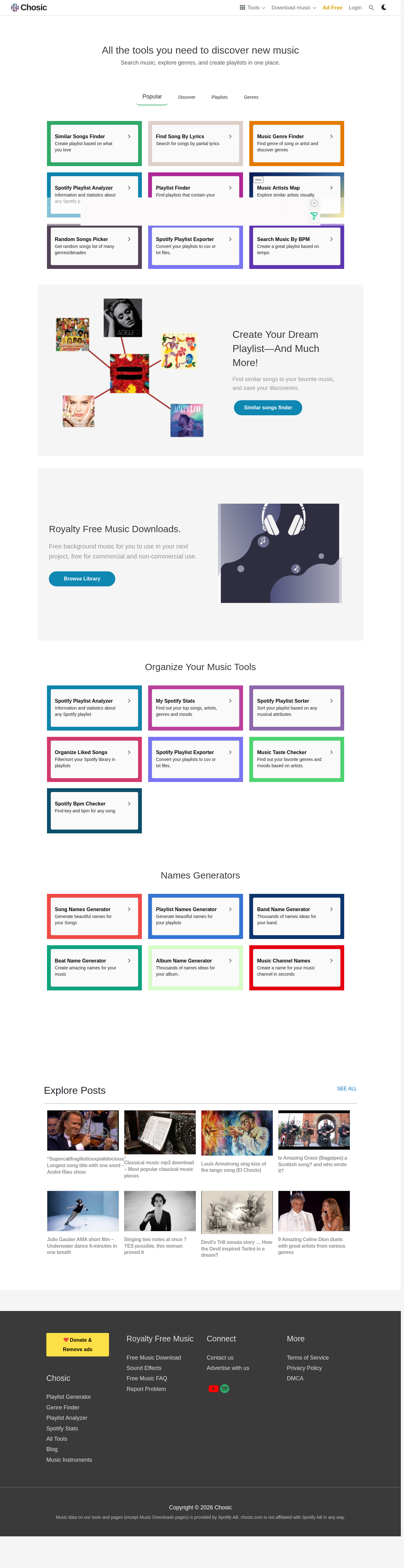 The page presents as Chosic (Discover New Music - Chosic) but the domain used is yip.su, a typosquat/redirecting domain. The final URL resolves to www.chosic.com, yet the initial domain and SPA indicators on the scanned page suggest impersonation and potential credential collection via dynamic JavaScript. Visuals and page title match Chosic, but domain intelligence indicates typosquatting near Wix-related signals, and the site uses extensive third-party trackers and iframes indicating a credential harvesting objective.