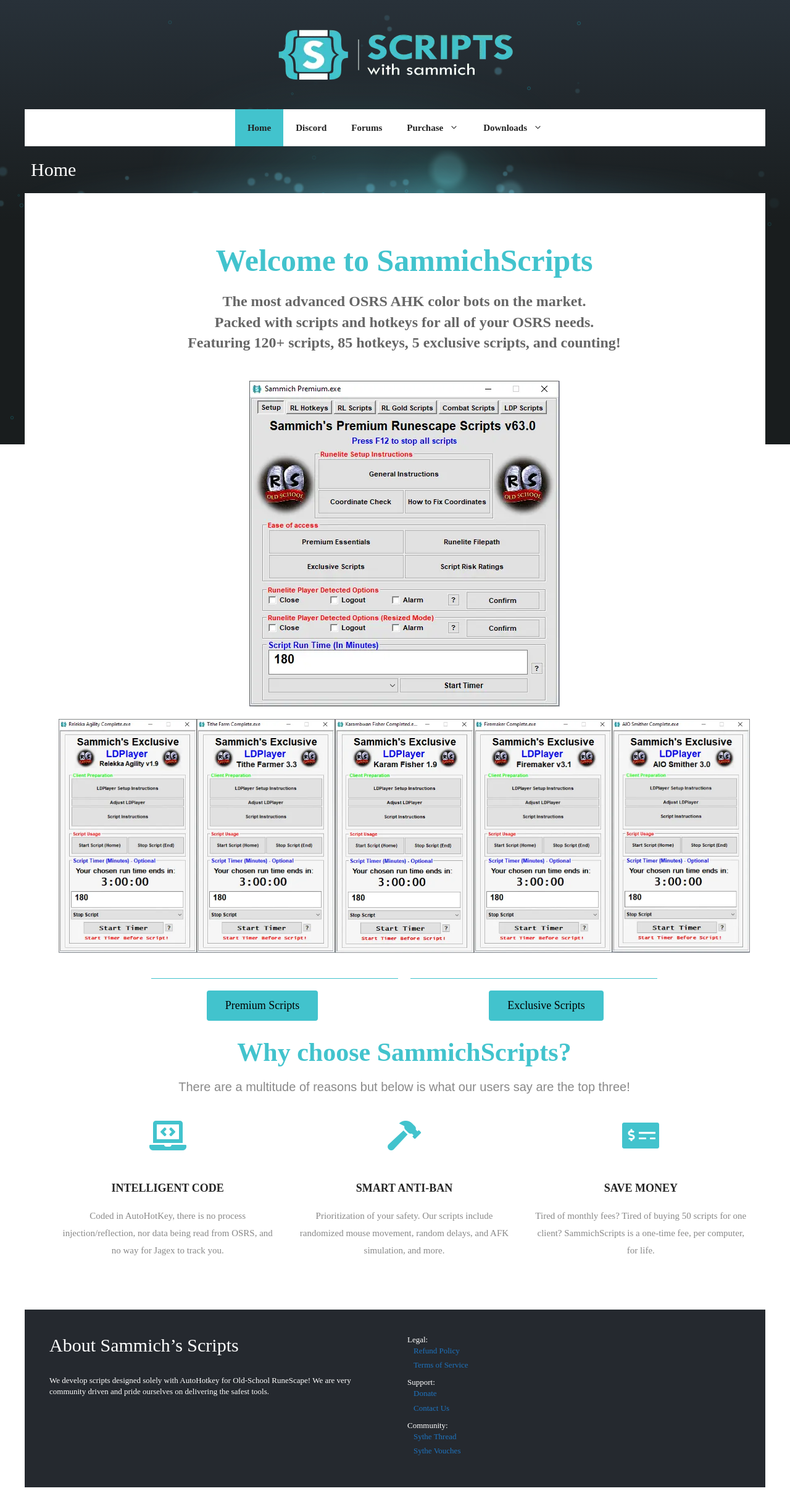 This site sammichscripts.com presents itself as SammichScripts – OSRS Scripts, using a polished UI with branding and a page title that suggests a legitimate OSRS scripting service. The page visually clones a software/script shop aesthetic and appears to solicit user interactions that could capture credentials or payment information, despite no static HTML forms. The domain is not the official SammichScripts domain, and the screenshot shows a branded layout designed to resemble legitimate software storefronts, indicating impersonation and credential harvesting risk.