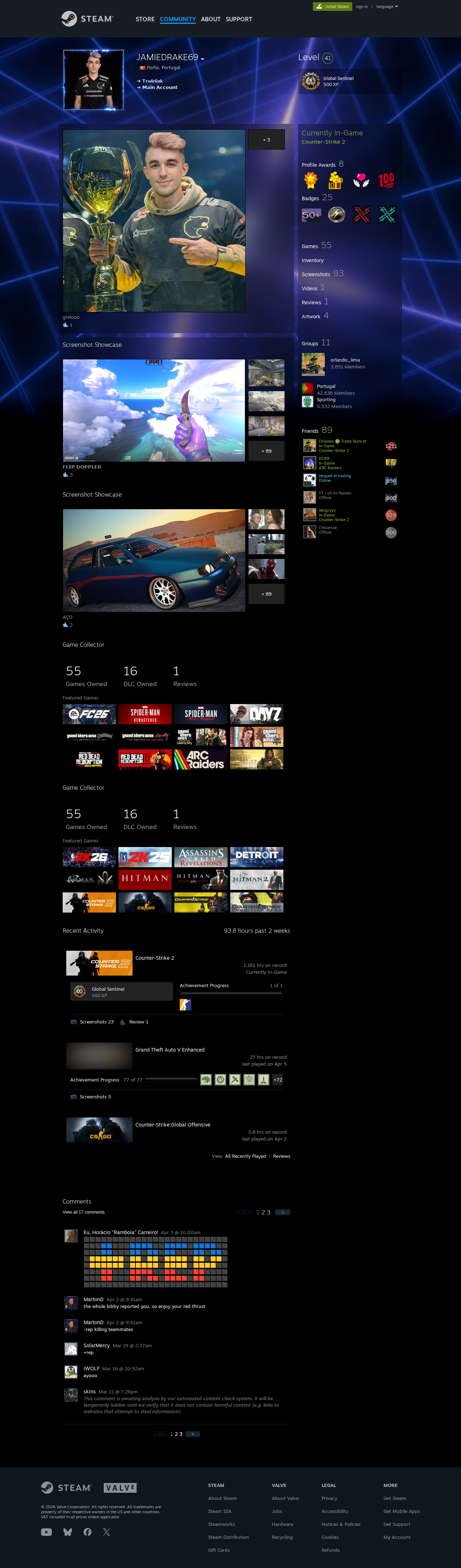 The page presents a Steam-branded Steam Community profile on the domain steamcommunity.com, with page title Steam Community :: JAMIEDRAKE69 and branding assets (Valve/Steam logos) loaded from Steam-supported CDN. While the domain appears to be the official Steam Community domain, the visible profile name and potential impersonation cues in the screenshot suggest a risk of identity impersonation. However, there is no direct evidence of credential harvesting, malware deployment, or payment fraud in the captured data; the page largely resembles a legitimate Steam Community user page rather than a classic phishing login surface.